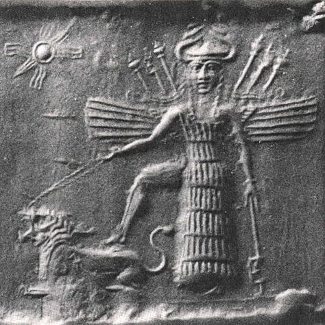 Sigillo cilindrico accadico risalente al c. 2300 aC raffigurante le divinità Inanna, Utu ed Enki, tre membri degli Anunnaki